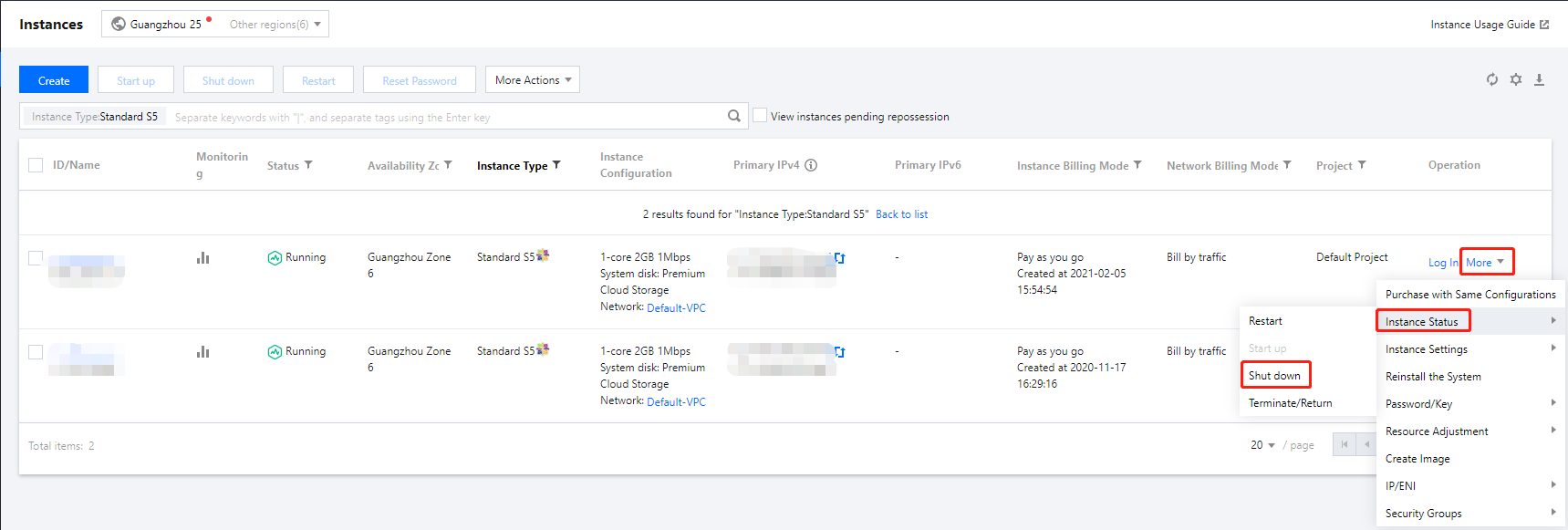 列表视图:选择实例所在行右侧的更多 > 实例状态 > 关机。如下图所示: