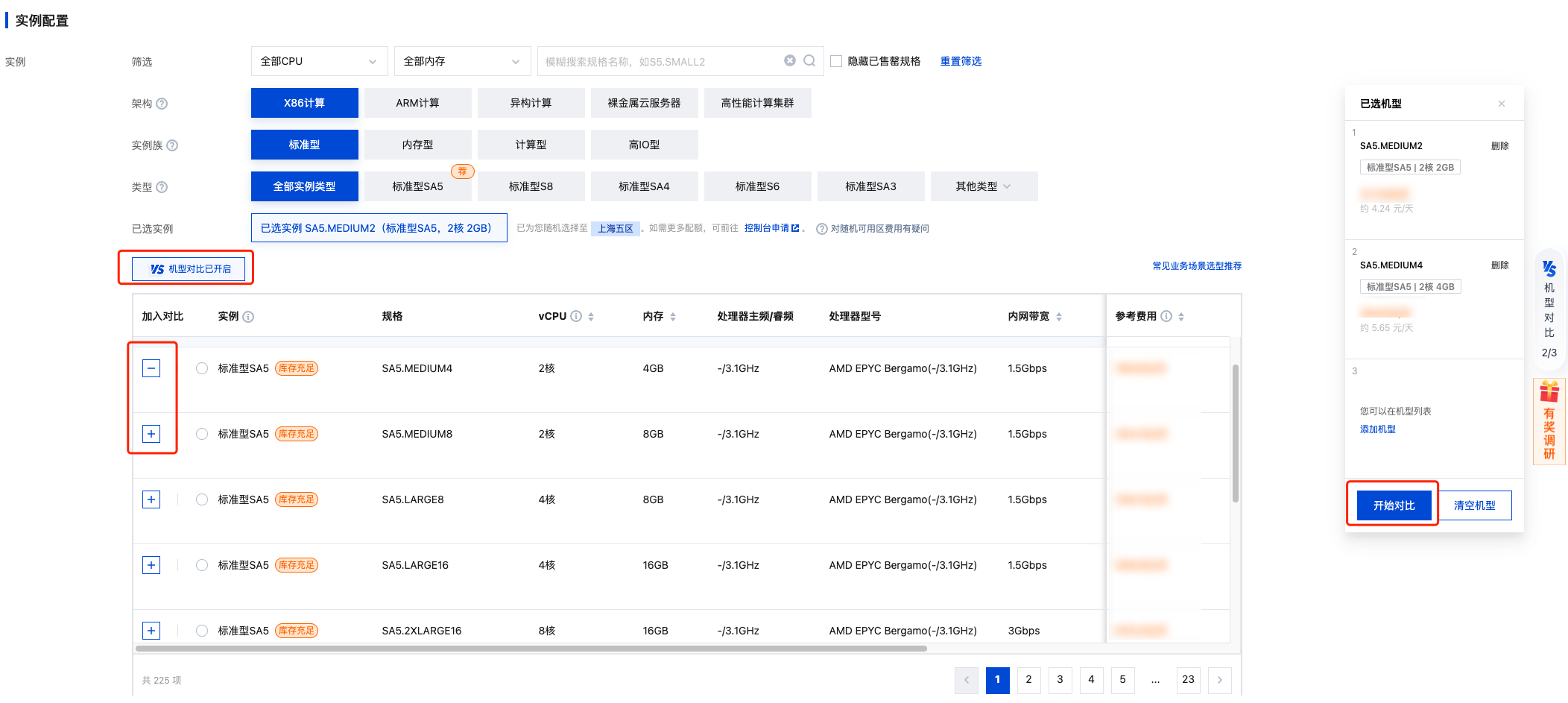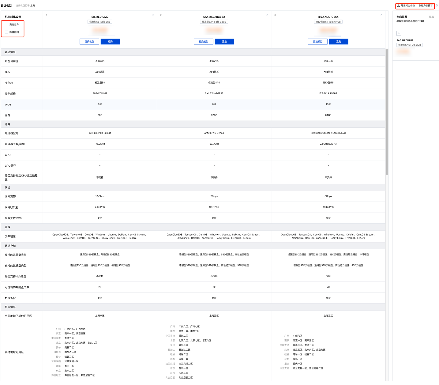 对比工具,横向对比多个机型的配置项参数、性能指标、价格等。同时根据您所选的机型配置,为您智能推荐最优机型,帮助您高效选购合适的云服务器。