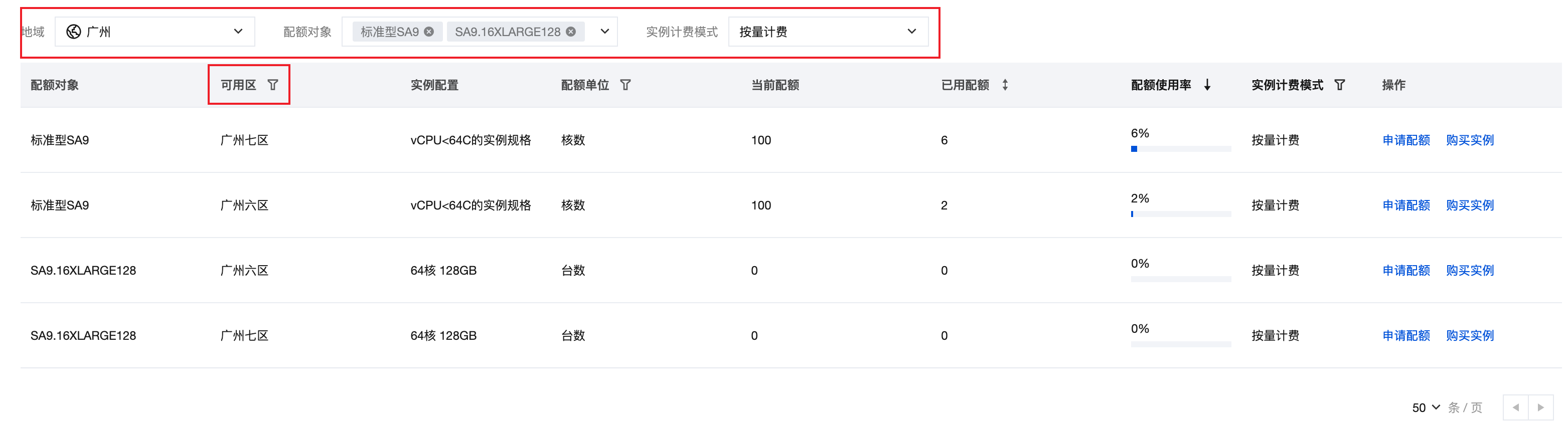 搜索对应机型,即可查看每个地域、每个可用区和特定计费模式下,具体机型的当前配额和已使用配额。