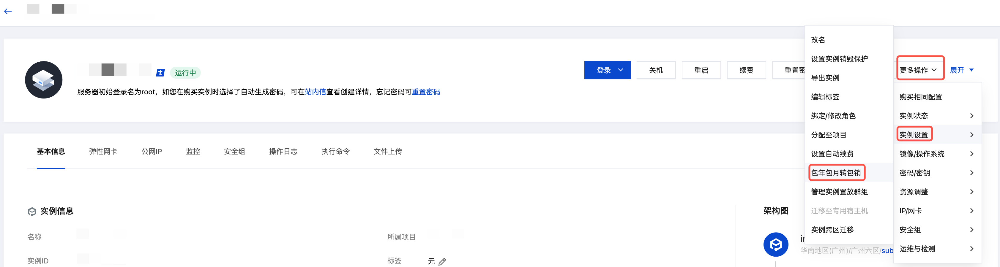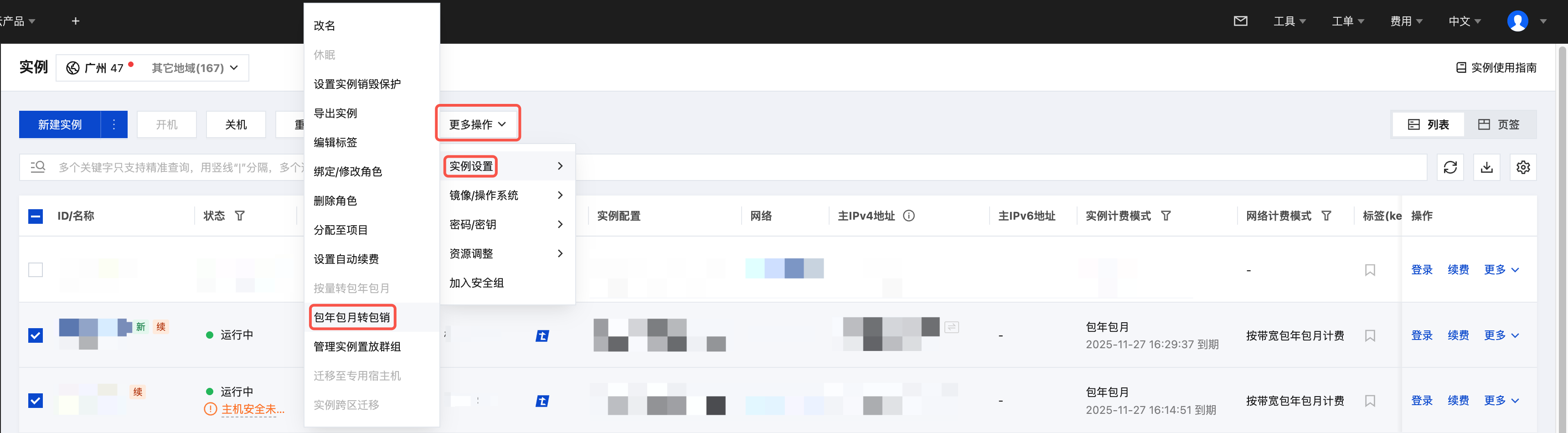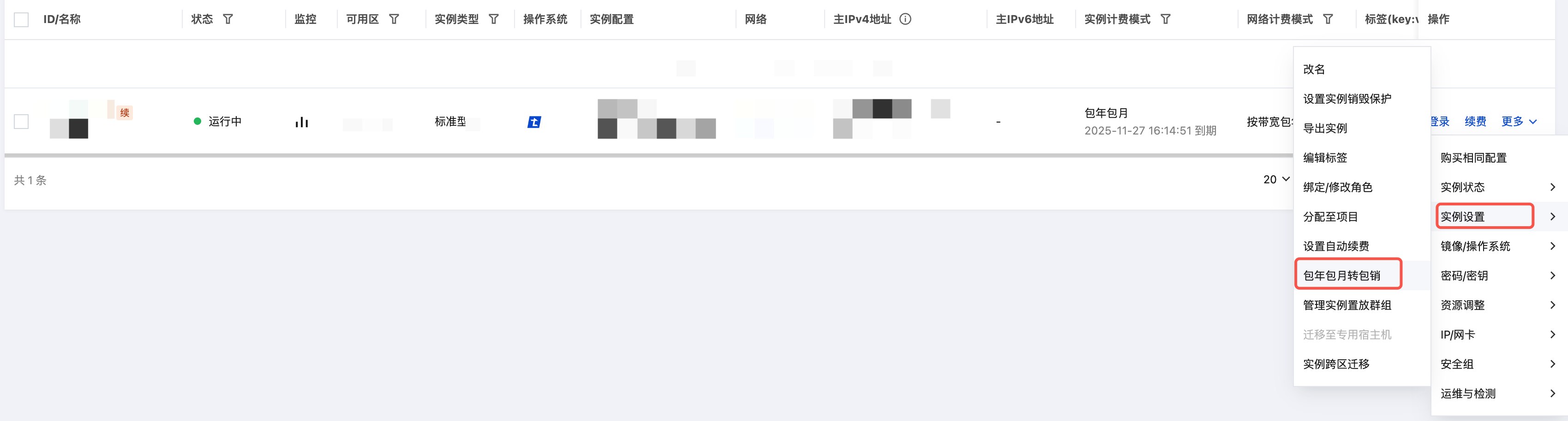 列表视图:在右侧的操作栏中,选择更多 > 实例设置 > 包年包月转包销。如下图所示: