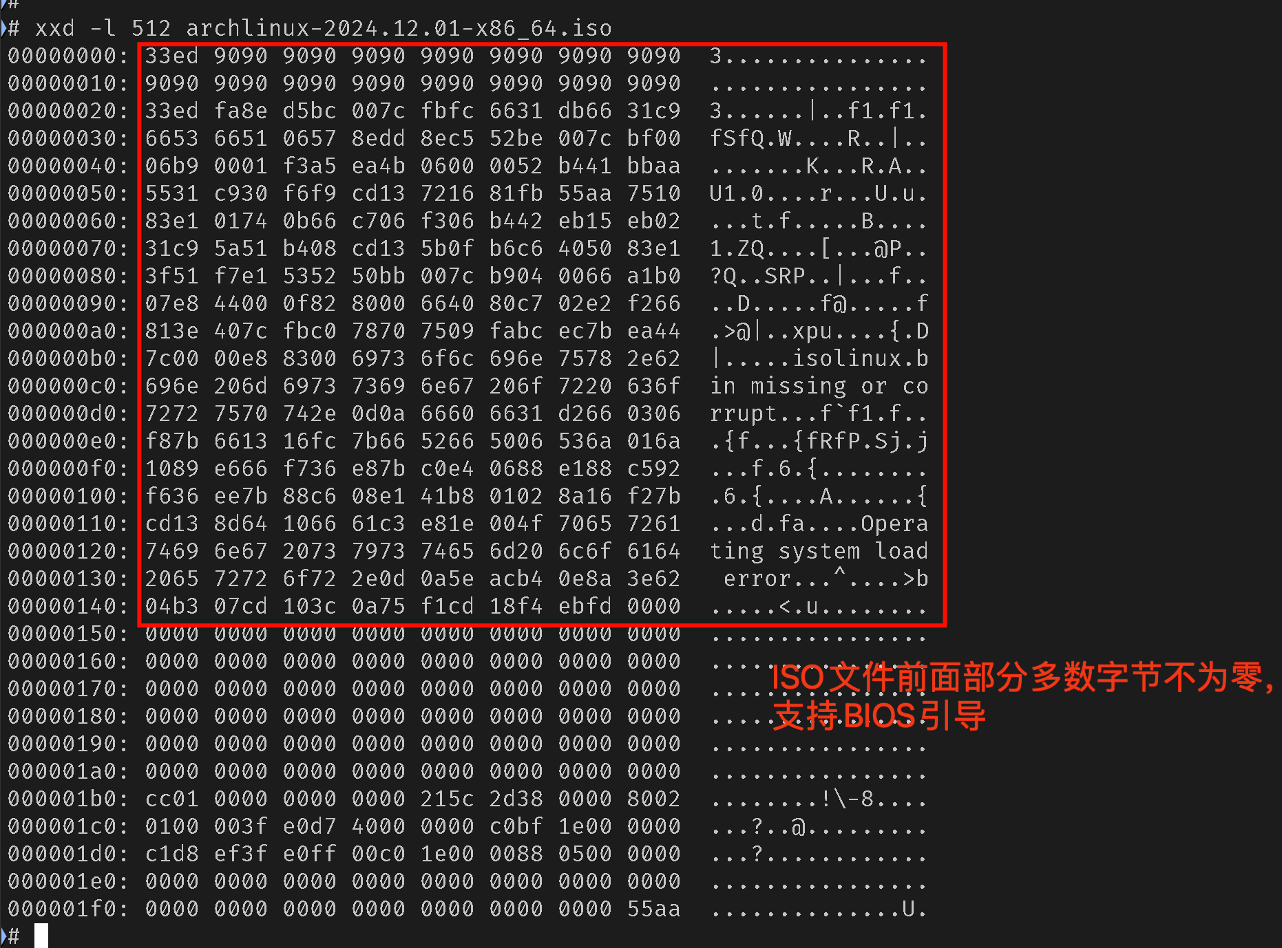 ISO 文件是否支持 BIOS 引导判断方法:如果 ISO 文件前0~446个字节非空,那么一般支持 BIOS 引导,否则不支持 BIOS 引导。