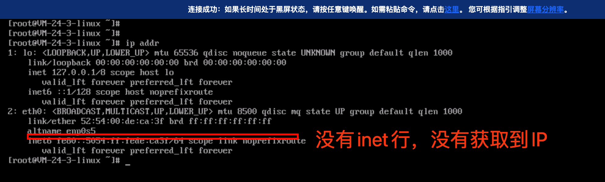 ip addr输出的结果中 eth 网卡没有 IP 地址。
