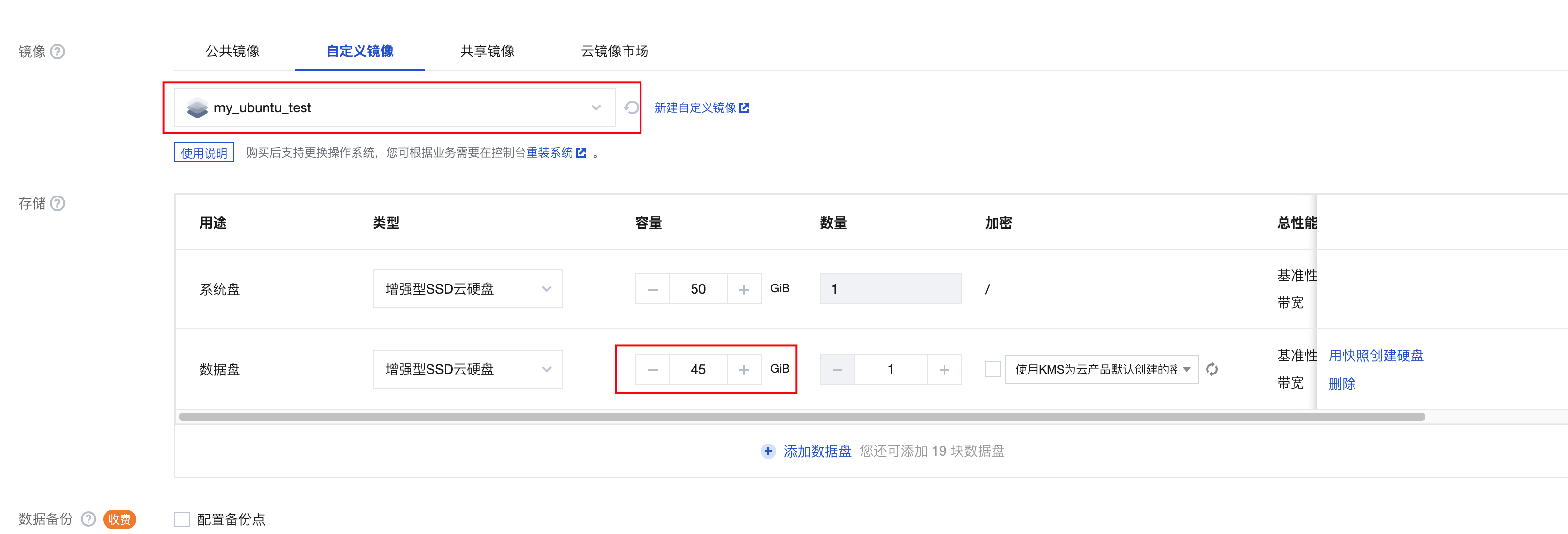 创建实例时,至少需要挂载一块数据盘,且数据盘容量不应大于系统盘容量。导入镜像后,默认可用空间与数据盘大小一致。