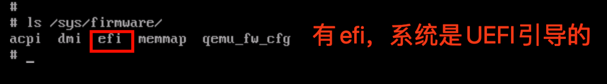 系统当前引导方式判断方法:可以根据/sys/firmware目录下面的内容来判断当前系统的引导方式,如果/sys/firmware目录下有efi目录,则是 UEFI 引导,否则是 BIOS 引导。