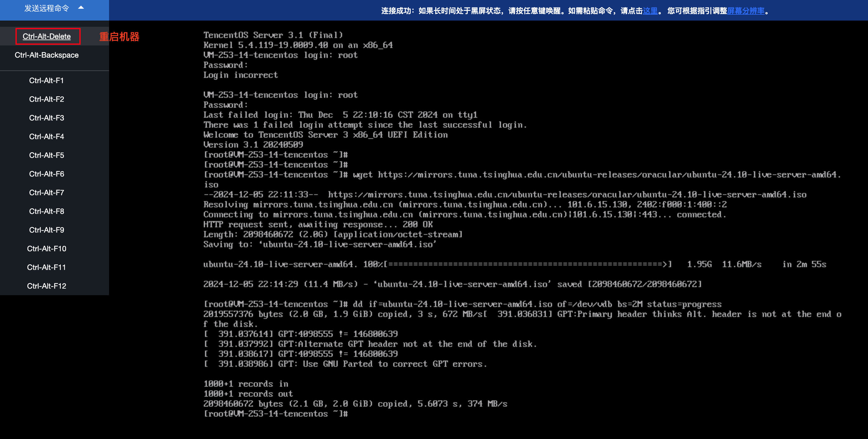 4. 通过 VNC 重启实例。