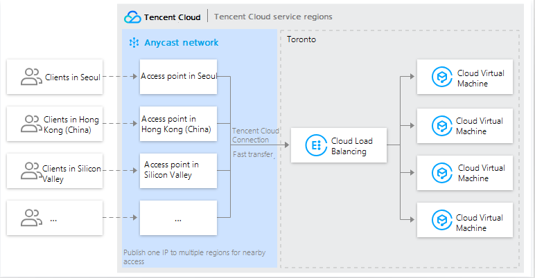 Anycast CLB 的 VIP 会发布在多个地域,客户端接入最近的 POP 接入点,通过腾讯云内网将访问流量极速转发至云服务器。Anycast CLB 支持的地域请参见