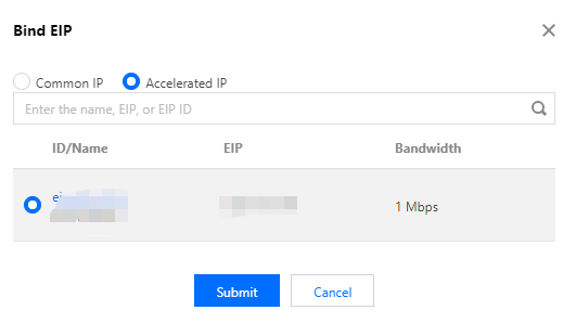 在弹出的“绑定弹性公网 IP”对话框,选择刚才创建的加速 IP,单击