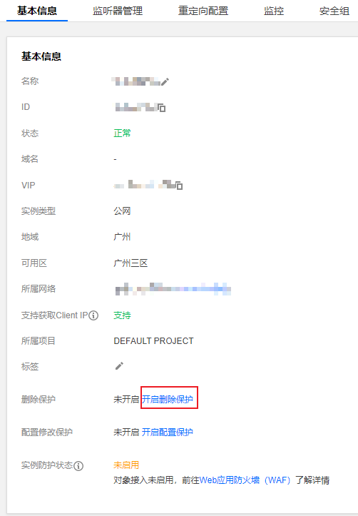 实例开启删除保护功能后,在控制台或调用 API 都无法删除该实例。若想删除实例,则需在实例基本信息页面单击