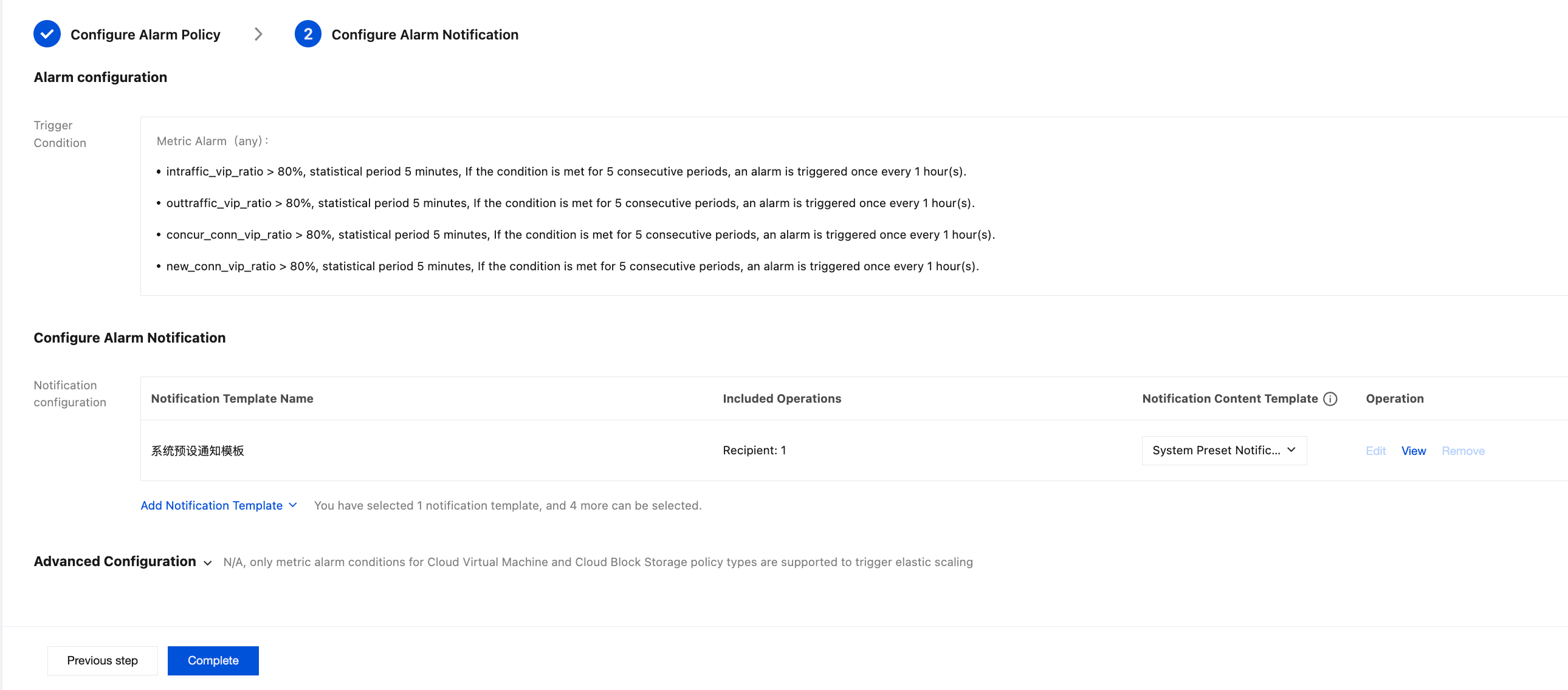 3.3 配置告警通知:添加通知模板,选择告警接收对象、通知周期与接收渠道。若未创建通知模板,请单击新建模板进行创建,详情请参见 新建通知模板。 4. 单击完成,即可完成配置入带宽利用率、出带宽利用率、最大连接数使用率、新建连接数使用率的监控告警。QPS 利用率监控告警请参考上一步骤新建告警策略,修改策略类型为负载均衡 > 公网负载均衡实例 > QPS 相关监控,触发条件配置以下内容即可。