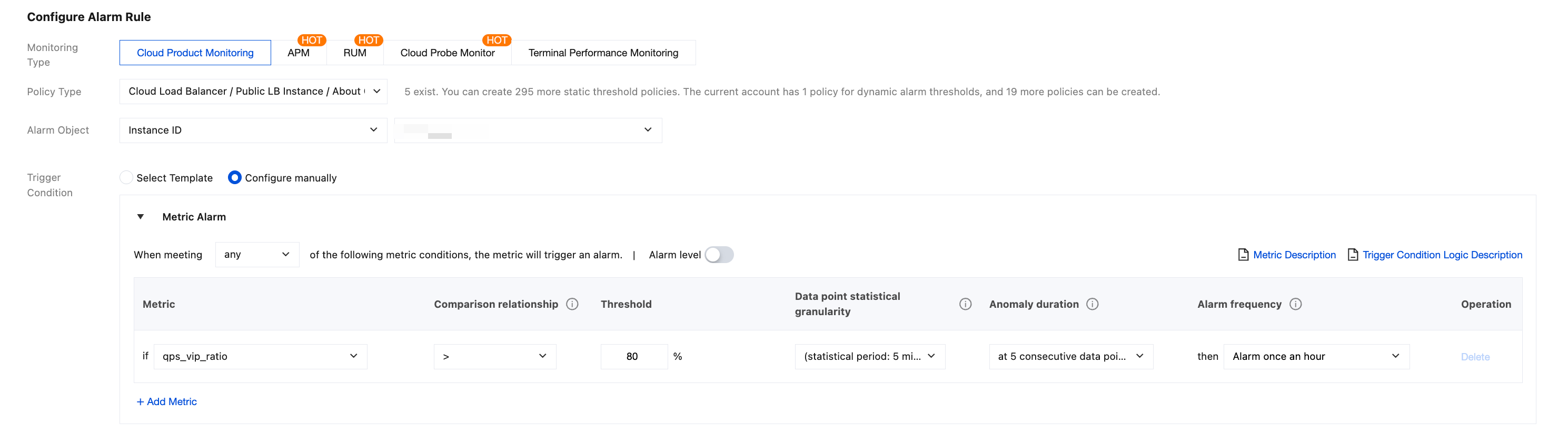 例如,告警指标为入带宽利用率、比较关系为 > 、阈值为 80% 、持续监控数据点为 5 个数据点、告警频率为每 1 个小时告警一次。表示:若某负载均衡实例的入带宽利用率连续 5 次大于 80% 则触发告警,告警频率为每 1 小时告警一次。