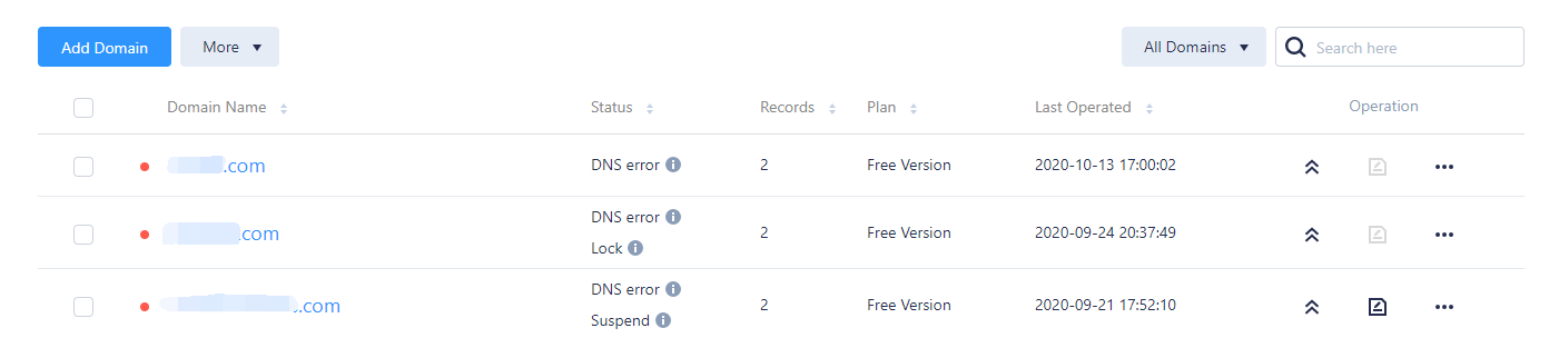 2. 在 “My Domains” 中,选择需要进行 CNAME 记录转发的域名,单击“域名”,进入该域名的 Record Management 页。如下图所示:
