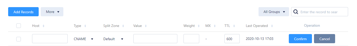 3. 单击 Add Records,填写以下记录信息。如下图所示: