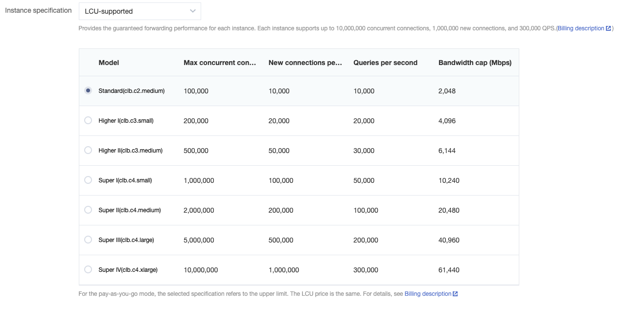 实例规格 | 支持共享型实例和性能容量型实例。 共享型实例按照规格提供性能保障,单实例最大支持并发连接数5万、每秒新建连接数5000、每秒查询数(QPS)5000。 性能容量型实例按照规格提供性能保障,单实例最大可支持并发连接数1000万、每秒新建连接数100万、每秒查询数(QPS)30万。 |
