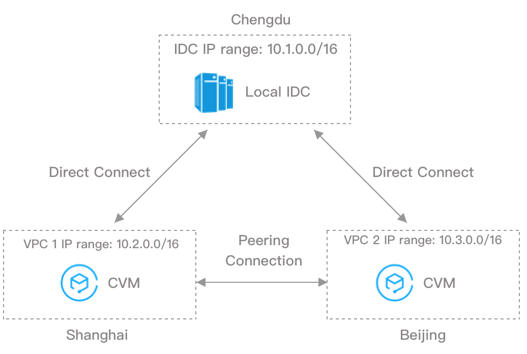 例如,在成都地域有一个网段为10.1.0.0/16本地数据中心,需要在上海和北京两个地域新建两个云上数据中心,且与成都的本地数据中心有通信需求,则建议上海和北京两个地域的云上数据中心的私有网络网段分别为10.2.0.0/16、10.3.0.0/16,避免因网段重复而导致无法进行通信。您可通过如下两种方式进行连接,实现本地数据中心与云上数据中心(即 IDC 与 VPC1、IDC 与 VPC2),以及云上数据中心间(即 VPC1 与 VPC2)的通信。