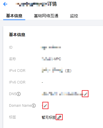 4. 分别单击如下编辑图标,可修改 DNS、Domain Name。