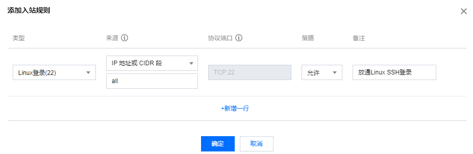那么,您可以在 安全组控制台 进入实例绑定的安全组,添加一条放通 TCP:22 端口的入站规则,可根据实际需求,在【来源】中默认选择 all 放通全部 IP,或填写指定 IP(IP 段)。 相关信息