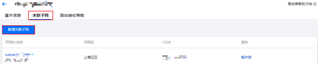 单击路由表 ID 进入详情页下的关联子网页签,单击新增关联子网。