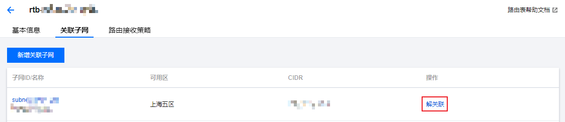 3. 单击路由表 ID 进入详情页下的关联子网页签,单击解关联。