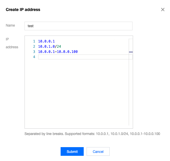 4. 在弹框中,输入来源 IP 地址范围,并单击提交。