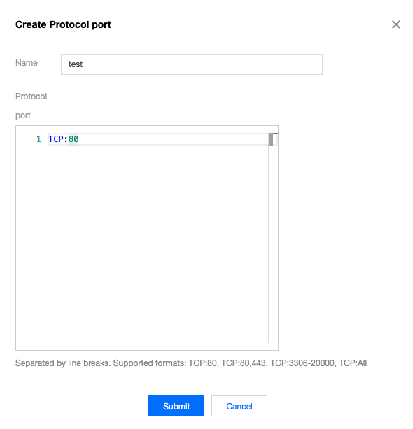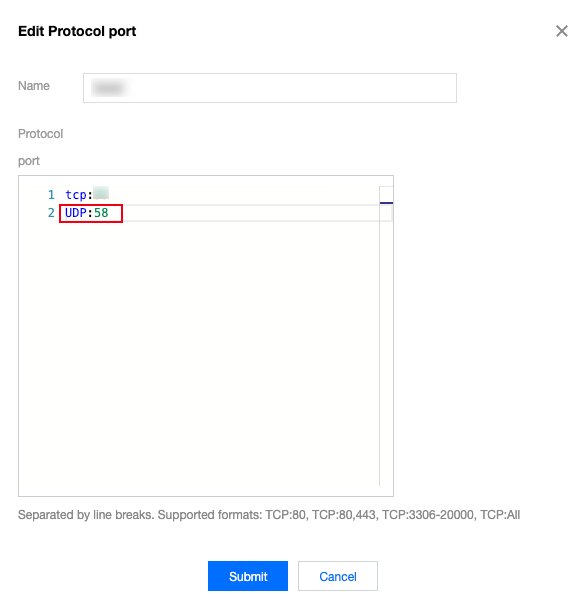 6. 在弹框中,换行增加 UDP:58 入站协议端口,单击提交。