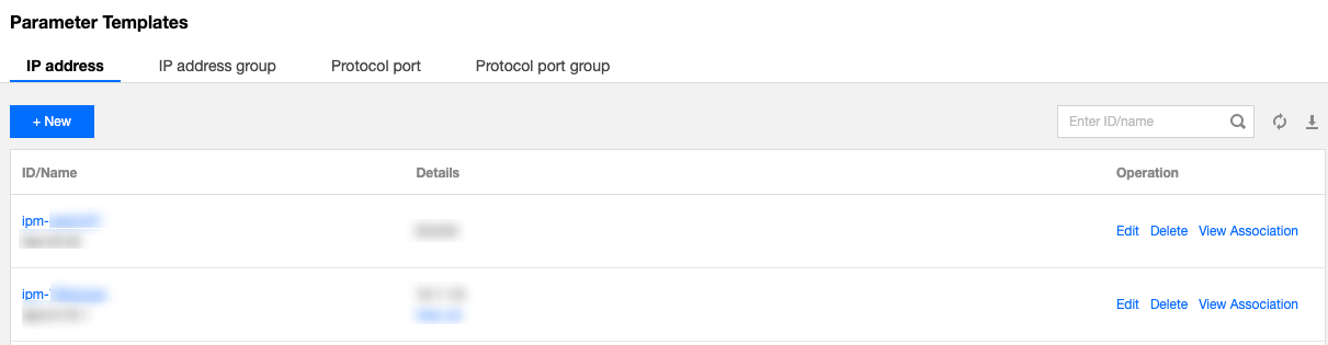 3. 在IP 地址页签,单击**+新建**,分别新建用于添加入站、出站规则的 IP 地址参数模板。