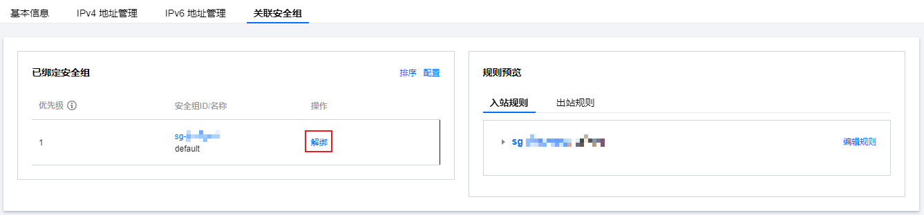 3. 在详情页的关联安全组页签中,单击需要解绑的安全组操作列的解绑。