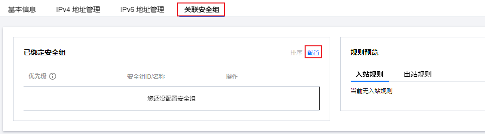 3. 在详情页的关联安全组页签,单击配置。
