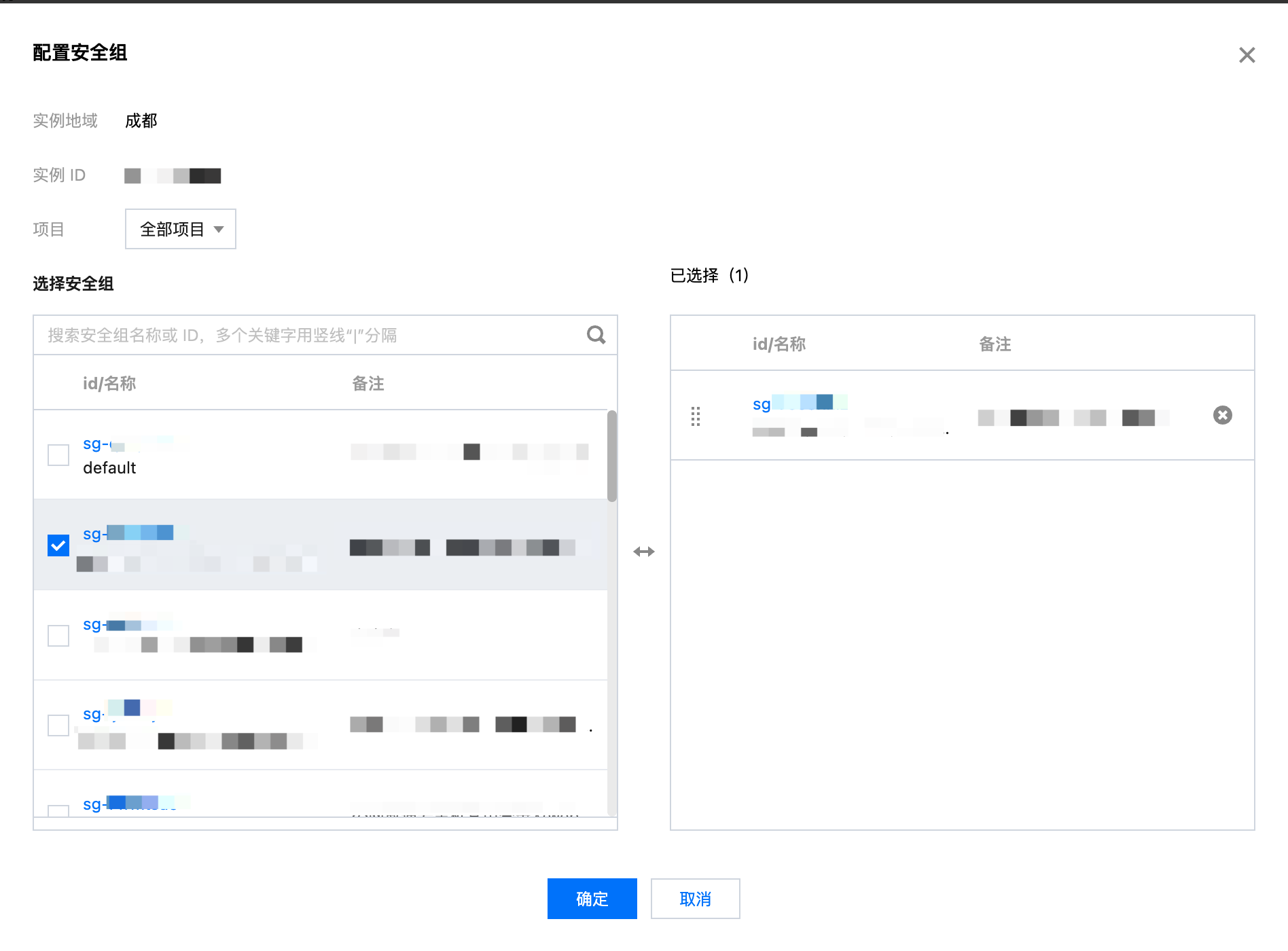 4. 在弹出的配置安全组界面,勾选提前准备好的安全组,并单击确定完成绑定。如绑定了多个安全组,则位置靠上的优先级最高,会优先匹配。