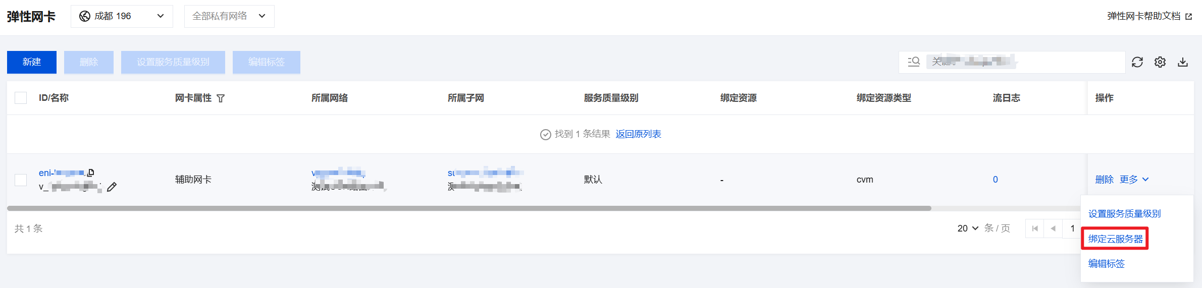 在弹性网卡列表页,找到需要绑定和配置的弹性网卡所在行,单击操作列的