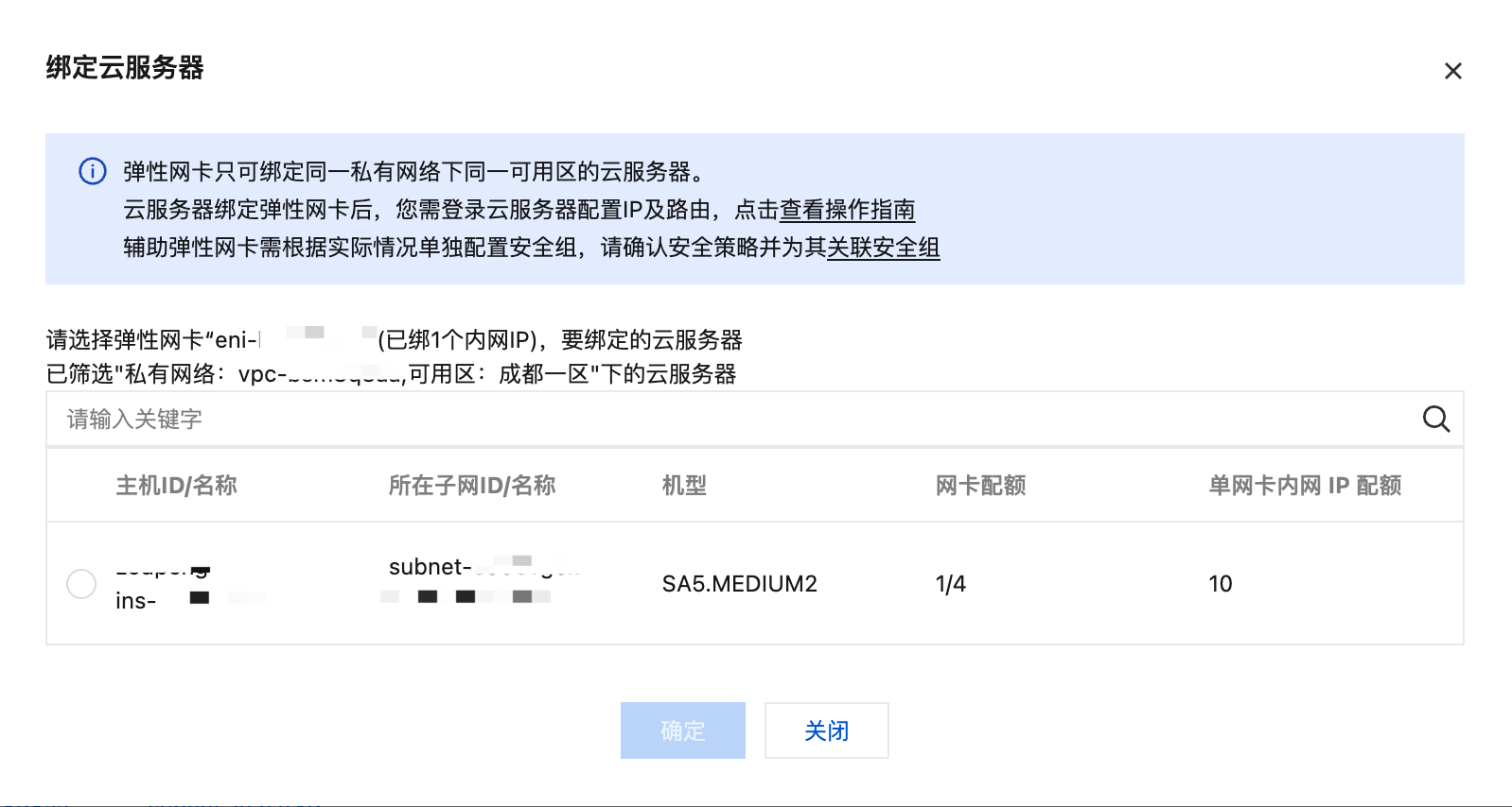 仅支持绑定和弹性网卡在相同可用区的云服务器,更多机型限制请参见