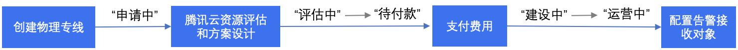 物理专线新建完成后,请及时联系您在腾讯侧的商务经理,配合您完成物理专线建设工作。如果您在腾讯侧没有商务经理,可提交 工单申请。 1. 创建物理专线:在控制台同步您的物理专线需求,完成后专线状态为“申请中”。 2. 资源评估和方案设计:腾讯云收到您的专线需求后,将进行资源评估,专线状态流转为“评估中”;随后专线经理与您同步确认专线设计方案,完成后专线状态为“待付款”。 3. 支付费用:在控制台完成付款后,专线状态流转为“建设中”。您还需要联系运营商和腾讯云共同完成专线建设和专线验收,并在控制台确认验收,完成后专线状态为“运营中”。 说明:
