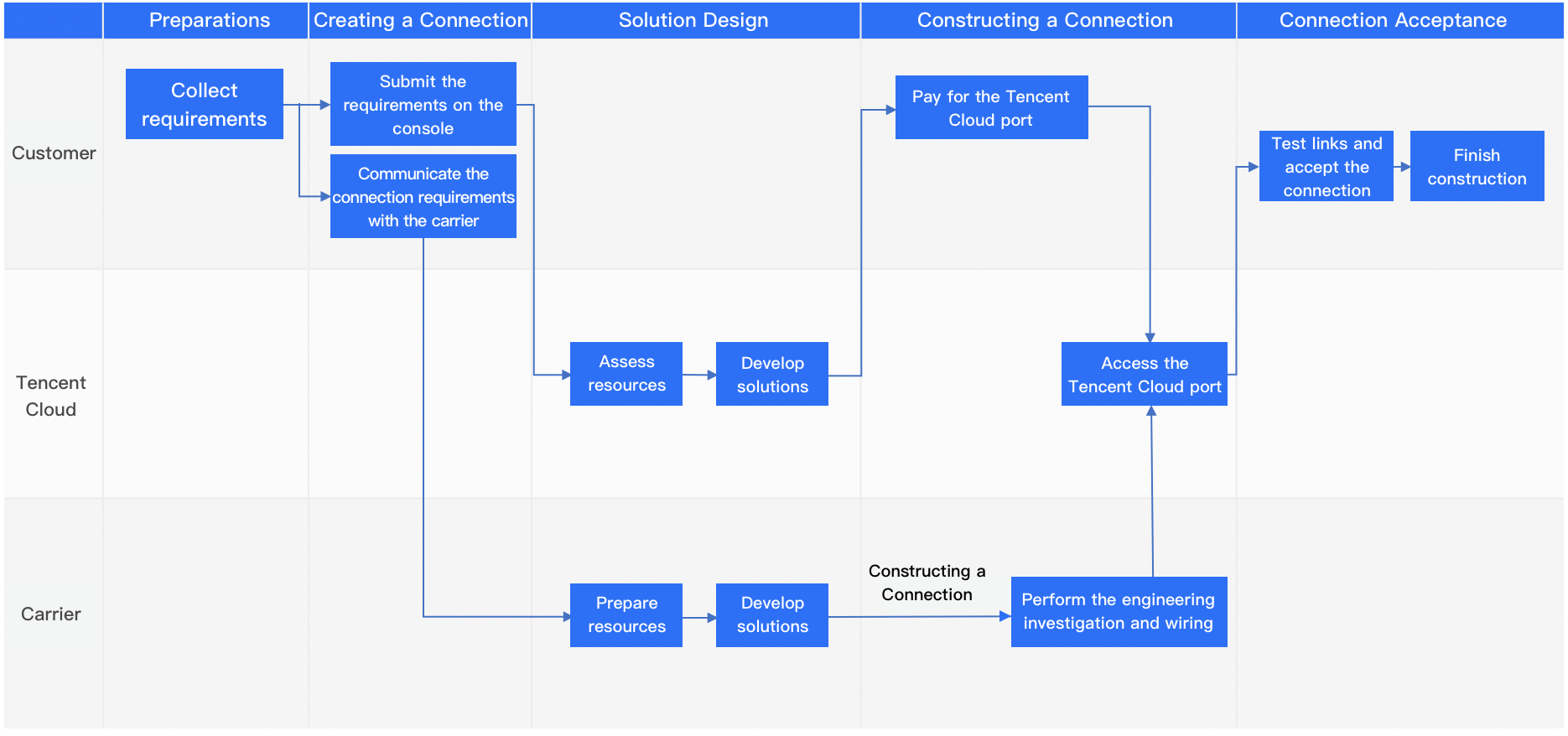 专线建设阶段包含运营商的建设和腾讯云的专线建设两个流程并行,具体如下: