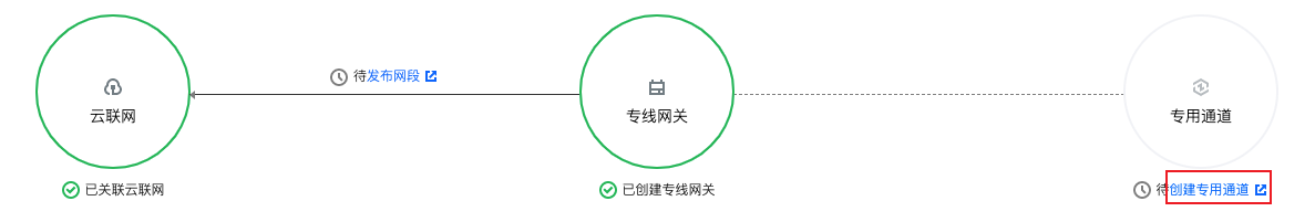 7. 在与专线网关相连的专用通道图标下,单击创建专用通道。自动跳转至专用通道创建页面,您可在该页面配置专用通道信息。
