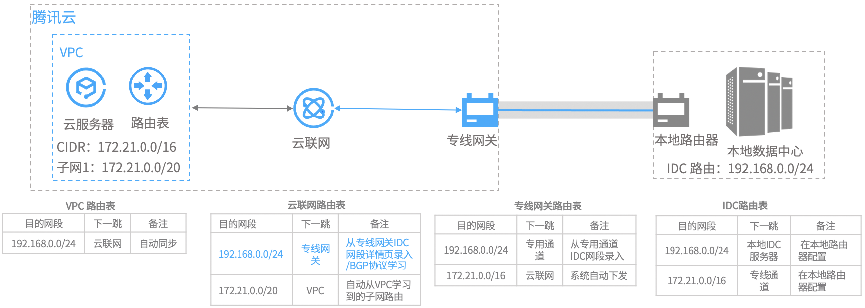 专线网关上的发布网段(即 IDC 网段)是指专线网关发送至云联网的路由。云联网收到该路由后,将自动新增一条下一跳为此专线网关、目的端为 IDC 网段的路由。
