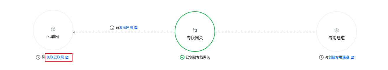如果 创建专线网关 时没有指定具体的云联网实例,请单击关联云联网,然后在弹出的对话框中选择待关联的云联网实例并单击确定。 成功添加云联网实例后,云联网图标将显示已关联且图标颜色显示为绿色,专线网关与云联网之间的虚线变为实线。即专线网关与云联网已互联。