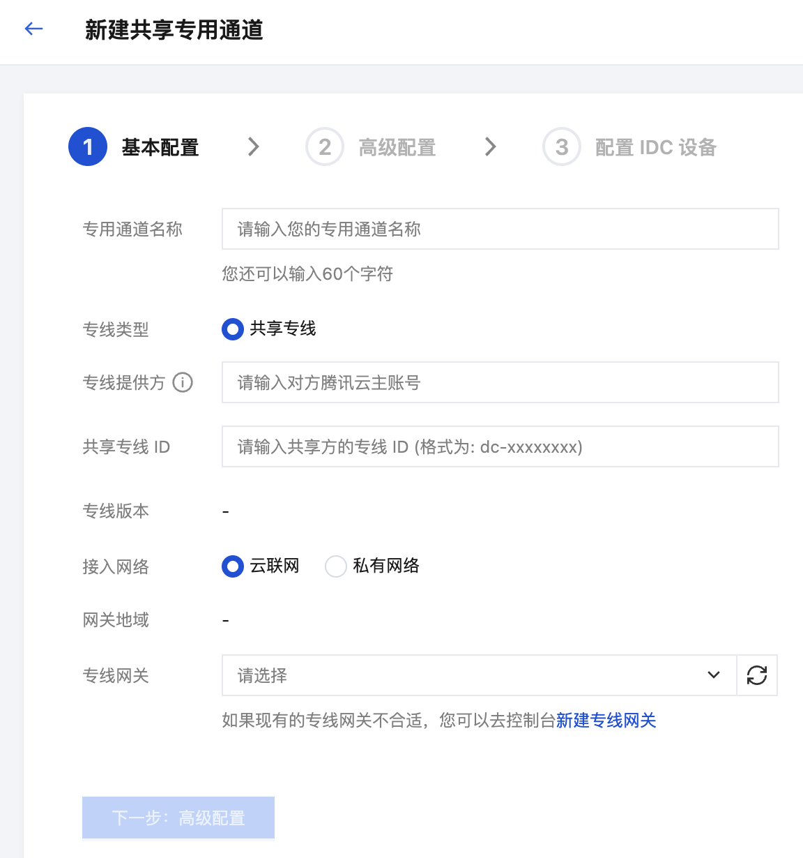 专线网关 | 关联已创建的专线网关,专用通道2.0不支持 NAT 型专线网关。 |