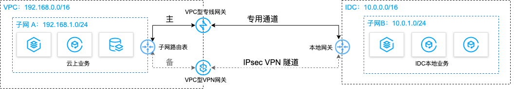 VPN 连接(备):本地 IDC 与云上 VPC 通过建立 VPN 安全隧道来实现云上云下业务通信,当专线链路出现异常时,可将流量切换至该链路,确保业务可用性。