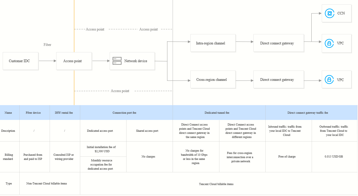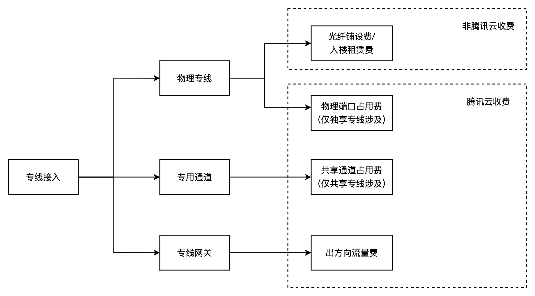 光纤铺设费:用户本地 IDC 与腾讯云专线接入点之间的运营商光缆铺设费用,由用户向运营商购买支付。
