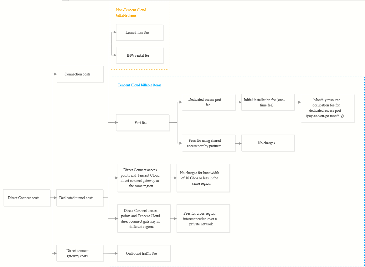 物理专线是指用户本地 IDC 与腾讯云专线接入点之间专线部分。用户成本包括腾讯云收费项和非腾讯云收费项。