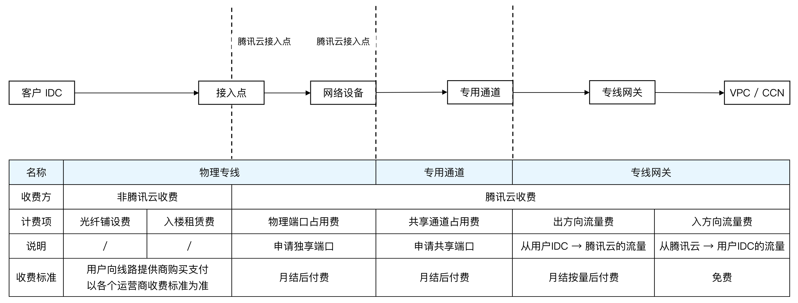 物理专线是指用户本地 IDC 与腾讯云专线接入点之间的专线部分。用户成本包括腾讯云收费项和非腾讯云收费项。