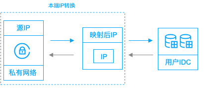 本端 IP 转换指私有网络内源 IP 映射为新 IP,并以新 IP 身份与专线对端互访。