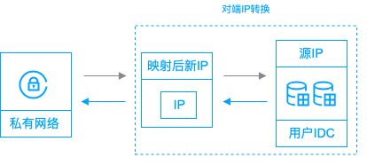 对端 IP 转换指用户 IDC 内源 IP 映射为新 IP,并以新 IP 身份与私有网络内 IP 互访。