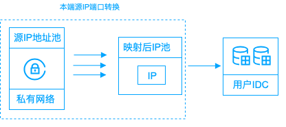 本端源 IP 端口转换指私有网络内 IP 通过专线网关主动外访时,以指定 IP 池内随机 IP 的随机端口访问专线对端的用户 IDC。