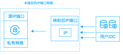 本端目的 IP 端口转换是专线对端主动访问私有网络的一种方法,将私有网络内指定 IP 的指定端口映射为新的 IP 和端口,专线对端则只可以通过访问映射后 IP 端口来与私有网络内指定 IP 端口通信,其他 IP 端口则不对专线对端暴露。