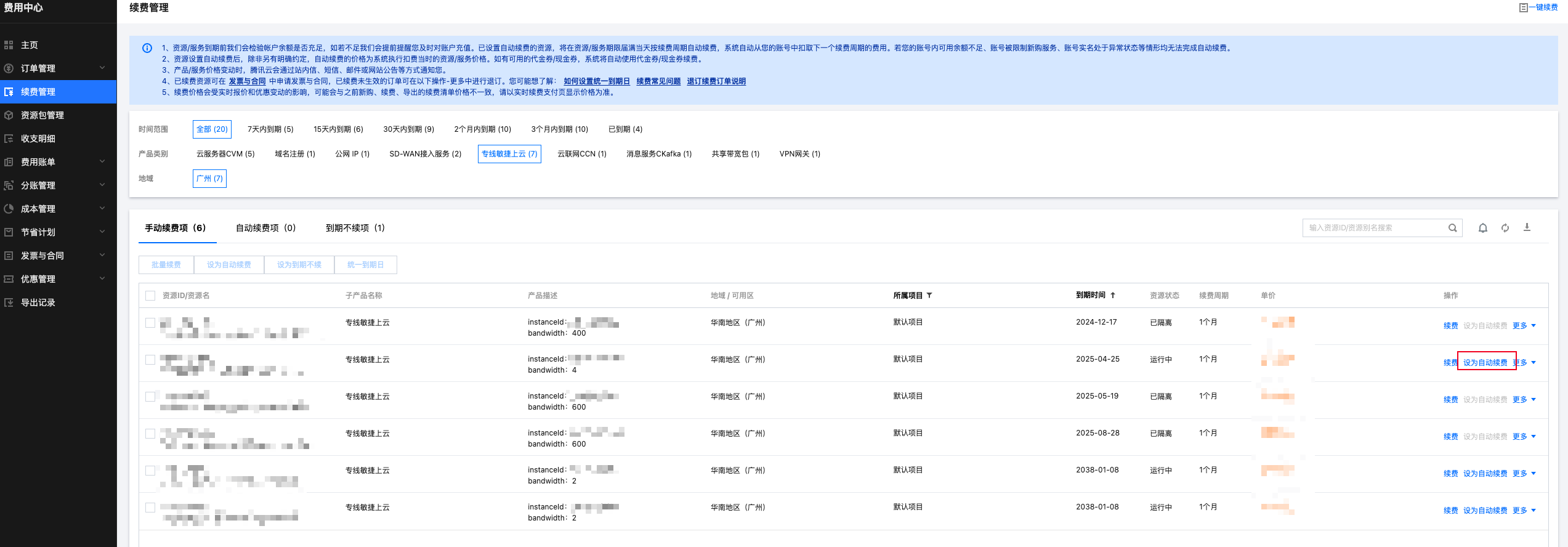 登录 续费管理控制台,找到您想要取消已订阅自动续费的产品,单击操作列的设为手动续费或更多,将续费模式改为其他方式。