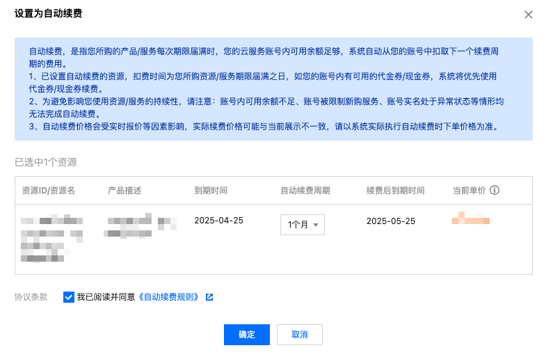 自动续费周期:以您设置的自动续费周期及模式为准。例如,您选择的周期为账户余额足够时,到期后自动续费一个月,系统即在每次到期前自动续费1个月。
