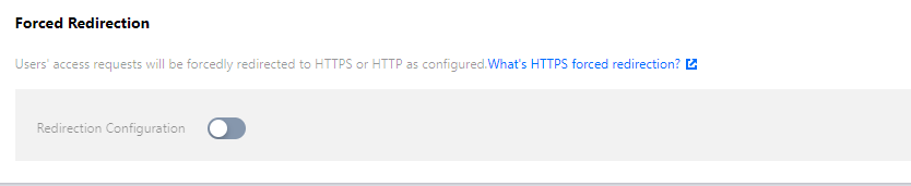 登录 CDN 控制台,在菜单栏里选择【域名管理】,单击域名右侧【管理】,即可在【Https 配置】中可看到【强制跳转】配置开关,默认情况下为关闭状态,默认不进行任何跳转: