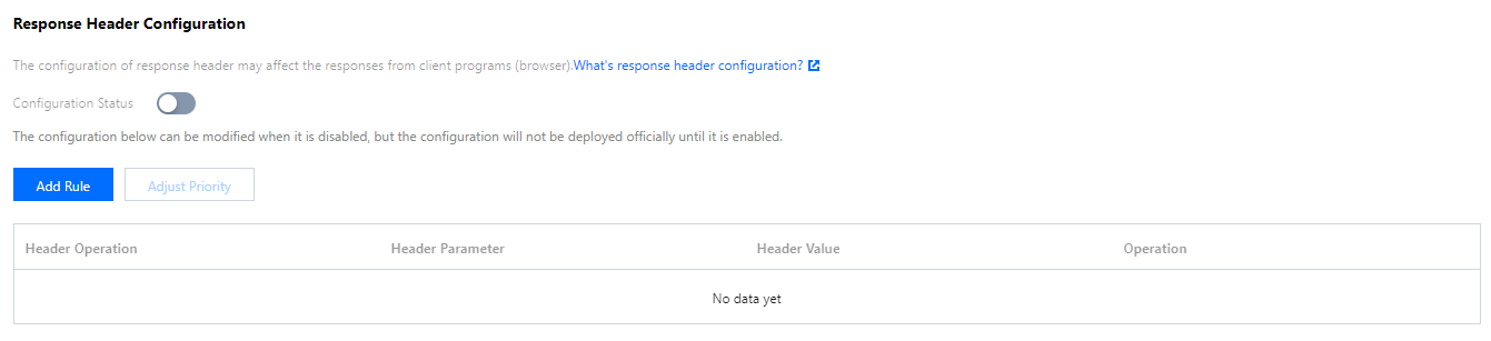 自定义 | 支持添加自定义 Header,自定义 key-value 设置。自定义头部参数:由大小写字母、数字及 - 组成,长度支持1 - 100个字符。自定义头部取值:长度为1 - 1000个字符,不支持中文。 |