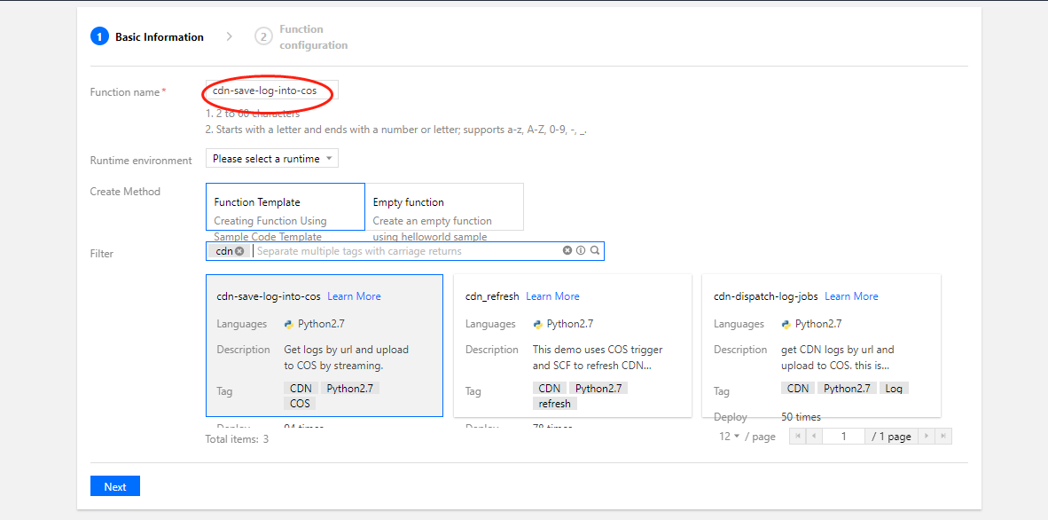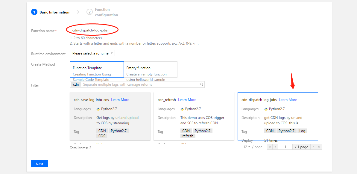 3、函数名称填写【cdn-dispatch-log-jobs】,并点击下一步;