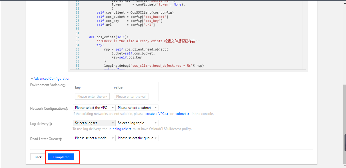 secret_id、secret_key、cos_region、cos_bucket、scf_region等字段需填写;